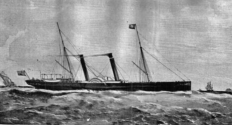 In 1862 the London and South Western Railway Company obtained Government permission to run steamship services and ordered the Normandy (Alderney 2s. stamp) from John Ash and Company, of London. This 600-ton iron paddle steamer, with a speed of 15'/2 knots, was a vast improvement on previous vessels. She was the first steamer on the route to have a straight stem and was a popular vessel. Unfortunately she met with disaster on March 17, 1869 when run down by the steamer Mary in dense fog some 40 miles SW of the Needles. A monument facing the entrance to St. Helier harbour, Jersey, commemorates the heroism of Capt. Harvey of the Normandy and the 30 crew and passengers who lost their lives in the collision.