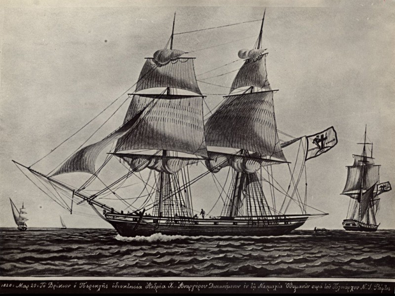 On the 1 dr. stamp is the War of Independence vessel Pericles, from Hadji Anarghyrou, on the Island of Spetsai, also by P. Gravalos. At the opening of hostilities the Greek fleet consisted mainly of vessels from the islands of Hydra, Spetsai and Psara. Some of these had been built before 1814 in preparation for the uprising, which was carefully planned over a period of many years. By March 1821, the islands of Hydra, Spetsai and Psara were stocked with guns, arms, ammunition, incendiary and combustible materials. SG1169