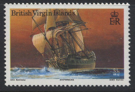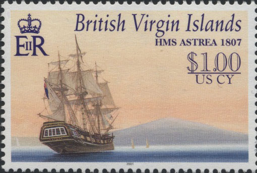 H.M.S. Astraea (Astrea in the stamp design). 5th rate, 32 guns, 703 tons (b.m.). Dimensions 126 ft. x 36 ft. built by Fabian, East Cowes, in 1781. She was wrecked on March 24, 1808, off Anegada, in bad visibility, when she struck a reef Four men were lost. The wreck still exists.