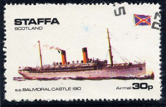 In Oct 1910 temporarily commissioned into the Royal Navy and manned by naval personnel in order to carry members of the Royal Family for the inauguration of the newly formed Union of South Africa. At the outbreak of WWI chartered as a Troopship carrying American troops across the Atlantic. Returned to mail service 1919 and passenger accommodation changed to 120 First 68 Second and 230 Third class passengers. In 1939 passenger capacity was given as 307 first, 230 third and 206 Tourist class. Sold May 1939 for breaking up Newport, Mon. for about £37,000 - Staffa 1974. Local issue 30p. NC (LB 5/128. Woad. WP Jan 98)