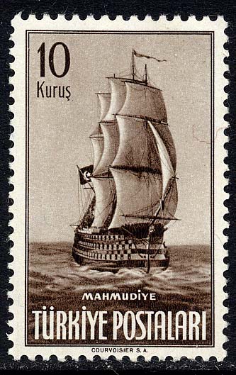 On July 1,1949, Turkey issued a set of stamps for the "Day of the Fleet" as a tribute to the Turkish Navy. The 10 kurus value shows the ship of the line Mahmudiye. This old "wooden wall" was built at the Arsenal at Istanbul in 1829. In 1854 she was with the Allied Fleet in the Crimean War, under Admiral Ates Mehmet Bey, and was commanded by Patrona Ahmet Pasa. She was 201.5ft. x 56ft x 28ft. depth of hold, drew 25.5ft of water, carried 128 guns and a war-strength crew of 1,280.