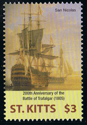 What the SAN NICOLÁS on this St Kitts $3 for the 200th Anniversary of the Battle of Trafalgar has to do with Trafalgar I wonder she was already before this battle taken by the Royal Navy., and did not take part in that battle.