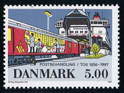 To mark the demise of the Denmark Post transport by ferry between Copenhagen and Fredericia, Denmark issued on 12 June 1997 a 5.00 Kr stamp showing a mailtrain being loaded onto one of the three identical trainferries in service.
