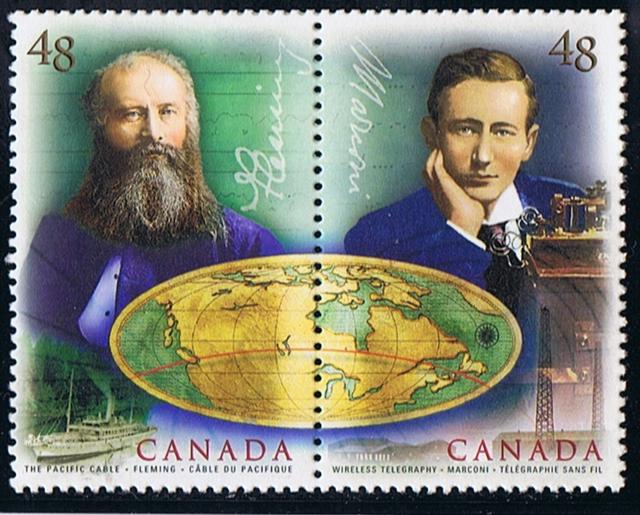 With the issue of a se-tenant pair of domestic rate ($0.48) stamps, Canada Post honours two significant events in the history of communications technology - on October 31, 1902, the Pacific Cable was opened, and on December 15th of the same year, Guglielmo Marconi sent the first radio message across the Atlantic Ocean, from Glace Bay, Nova Scotia, to Poldhu, England. The two stamps appear together in a pane of 16.