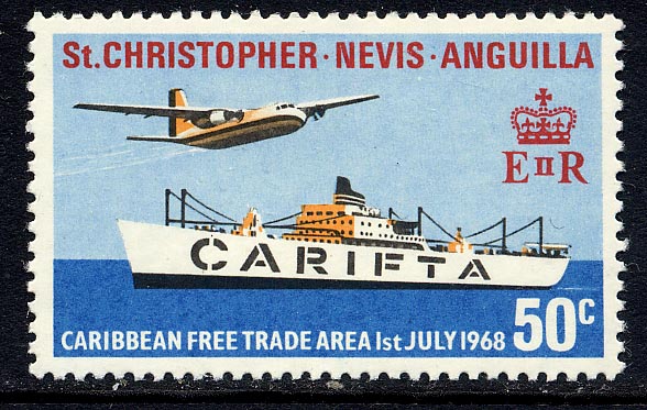 To commemorate the Caribbean Free Trade Area Conference of July 1 1968 the St. Christopher-Nevis¬Anguilla Post Office issued two stamps, of 25c and 50c values, in the same design, a cargo vessel with "Carifta" on her sides. The vessel is the Jamaica Producer, built in 1962 by Lithgows, Ltd., Port Glasgow, for the Jamaica Banana Producers S.S. Co. Ltd., Kingston, Jamaica. She does not of course, have "Carifta" painted on her sides. The ship is engaged in the London-Jamaica service, her gross tonnage being 5,781 and net 3,112. Deadweight is 5,100 tons on dimensions 397.0 (o.a.) x 56.3 x 24.1 ft. Refrigerated cargo space amounts to 223,967 cub. ft. Her engines are of the Sulzer type, supplied by D. Rowan and Co. Ltd., Glasgow, giving a speed of 17 knots. Twelve passengers are carried.