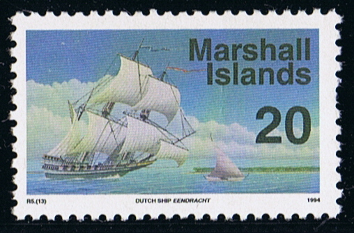 The designer of the stamp Keith Reynolds gives that she is the EENDRACHT who sighted Taongi one of the Marshall Islands on 25 January 1625. The date given is wrong, the fleet according the journals sighted Guam at that date.