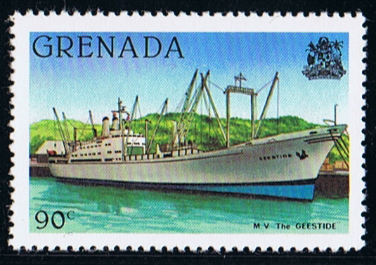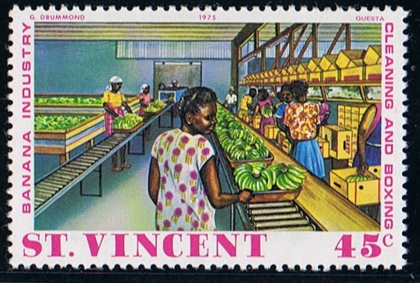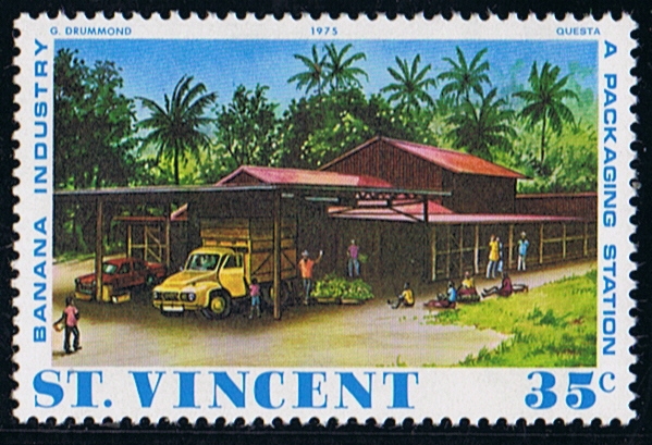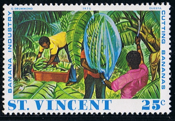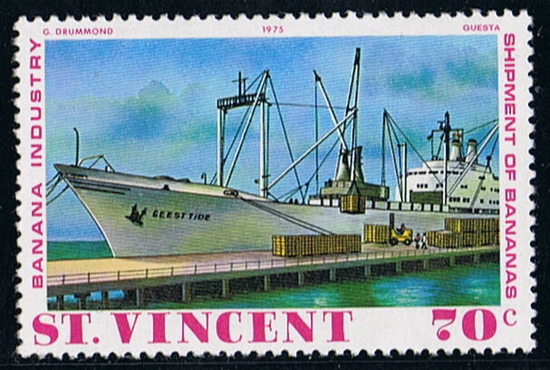 The set of stamps issued by St Vincent in 1975 shows the growing and handling of the bananas, and the 70c stamp depict the GEESTTIDE loading boxes bananas on pallets, alongside the pier in Kingstown, I have been many times alongside this pier when making a charter voyage for the Geest Line. Loading took two days, the farmers commenced cutting in the morning when they know the vessel would arrive that day, loading commenced 18.00 till the harvest of that day was loaded, the next day was a repeat of the first one, and around 02.00 we sailed to the next island to start loading again around 18.00. Mostly we made calls at three islands before heading to Barry Docks in the Bristol Channel for discharging.