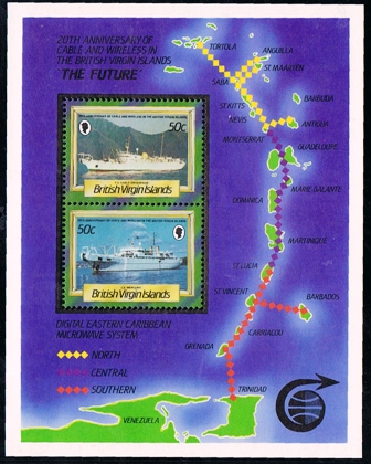 British Virgin Island 1967 4c and 50c sg 217 and 219, scott 183 and 185, 1986 60c and 50c sg MS 623. (The other cabble layer on the MS is the CABLE ENTERPRISE)