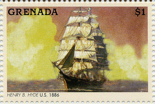 The design stamp is made after painting of H. Shimidzu- Downeaster Henry B. Hyde off Cape Horn.
