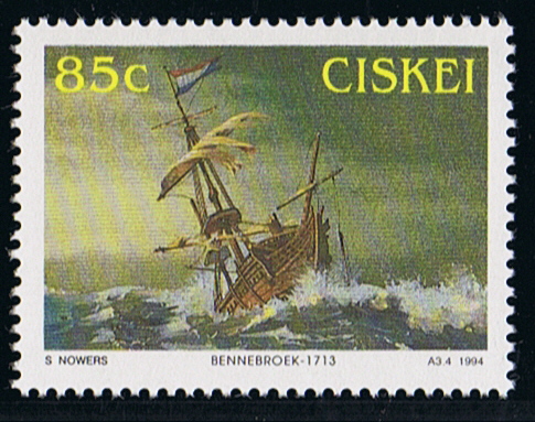A little south west of Ceylon the fleet encountered a storm and the BENNEBROEK, though undamaged, was parted of the other vessels. A second storm struck, and the vessel, which was only four years old, was badly damaged, with two of her masts broken. When the coastline of South Africa appeared, there was little the crew could do to prevent her running ashore.