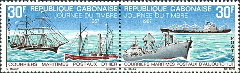 The vessel depicts on this stamp of Gabon in 1967 is designed after a water-color made by the painter Zeide Cadinouche in 1967 on orders of the Delmas-Vieljeux Comp.