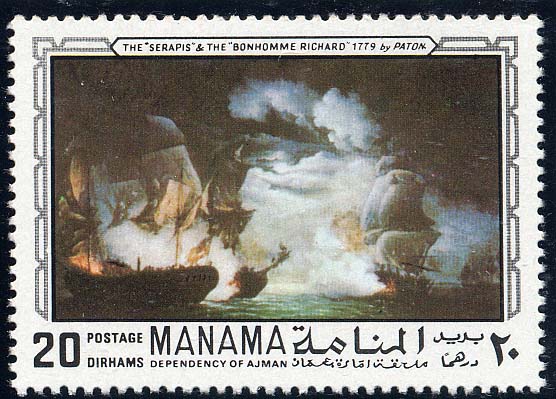 H.M.S. Serapis is shown on the 35c. stamp in her own right. Previous stamp issues have depicted her in the engagement with the Bon Homme Richard. She was a 5th rate, 44 guns, completed at Rotherhithe on March 4, 1779; built by Randall. Her tonnage was 886 builders' measurement. After her capture by John Paul Jones on September 23, 1779 off Flamborough Head, she was transferred to the French Navy. SG411