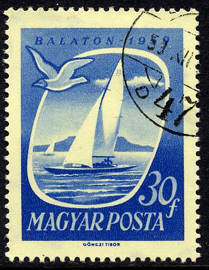 This 30 Ft. stamp depicts the cruising yacht Kek Madar ( Blue Bird ), a winner of many international championships. Her owner is Ladislas Farkas, manager of the Balatonfured Shipyard where she was built. She has a mahogany hull and oak frames after the design of Eugen Hankoczy, an engineer in the yard. The sail area is 30 square metres.