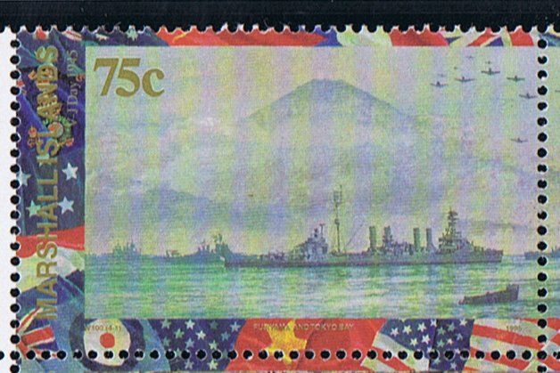 Mr. Mario Rosner has identified the ship depict on this stamp as the USS DETROIT, she was the only of the four funnel Omaha class present at Tokyo Bay during the signing of the Japanese capitulation on board the USS MISSOURI on 02 September 1945. Comparing the stamp with a photo of the ship he is correct she is the DETROIT, with in the background the Fujiyama Mountain.