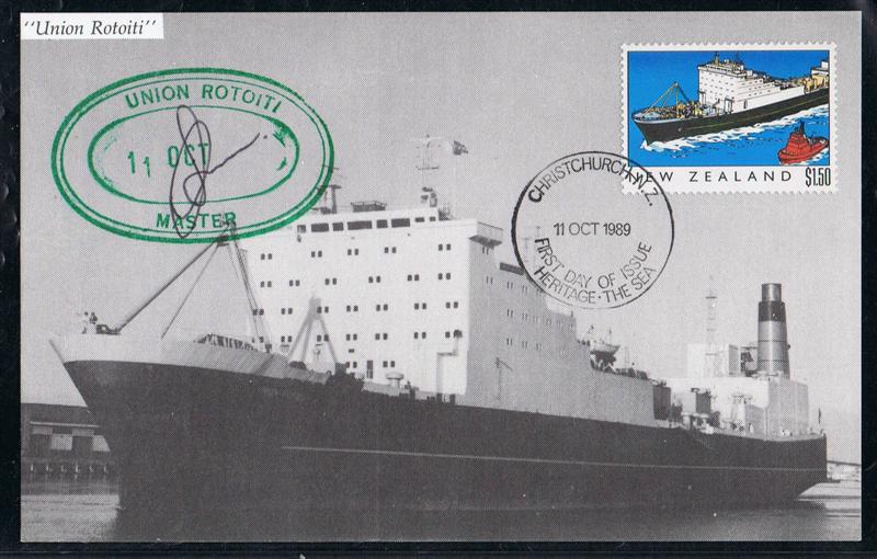 There is some confusion under the ship stamp collectors which vessel is depict, the UNION ROTOITI or the UNION ROTORUA, I have a maxi-card of the stamp, and the maxi card is signed by the master of the UNION ROTOITI Capt. Chris Morris. The New Zealand sources give that the UNION ROTOITI is depict.