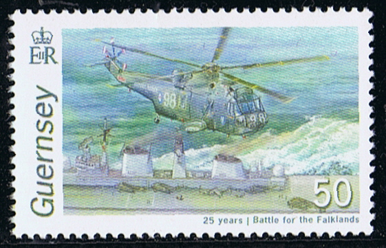 Guernsey 2007 50p sg?, scott? (The Guernsey Philatelic Bureau gives: "the Sea King helicopters evacuating men from the burning SIR GALAHAD, but she is not depict on this stamp, the stamp shows us HMS INVINCIBLE.)