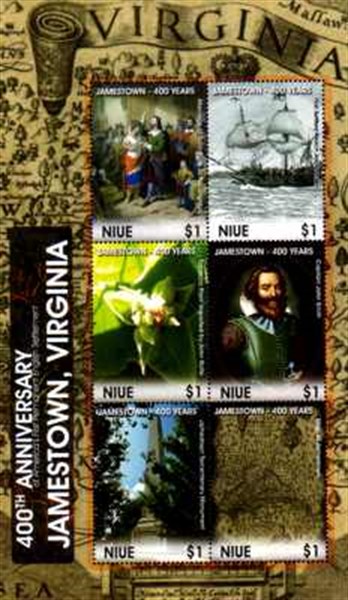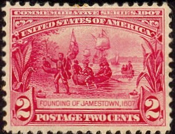 The triangle form of the stamp has the same shape as the first fort raised by the Jamestown settlers, after their arrival in 1607.