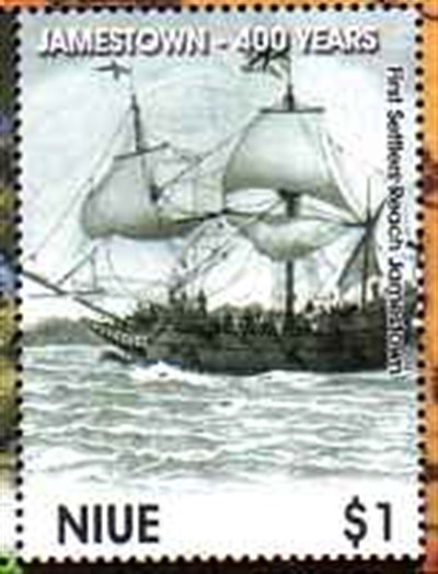 For the 400th Anniversary of the settlement of Jamestown Va. by English Colonists the United, States Post issued a triangle formed stamp in 2007, which depicts the three vessels SUSAN CONSTANT, GODSPEED, and DISCOVERY.