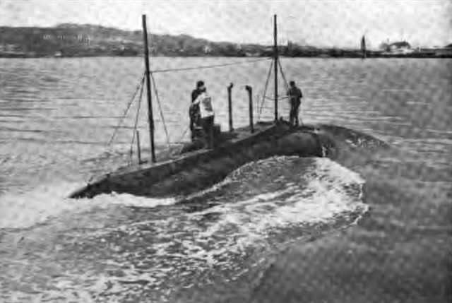 Powered by one Otto gas engine, 160 hp, ; Electric Dynamo motor, 150 hp., speed surface 8, submerged 7.