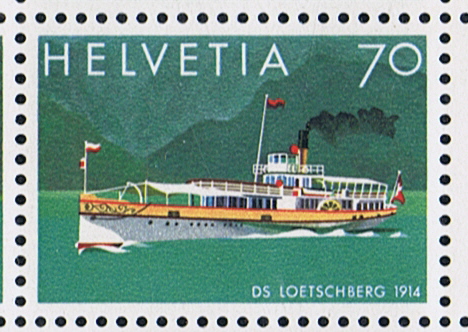 The LoTSCHBERG is the only paddlesteamer on the scenic Lake Brienz.She sails twice a day from Interlaken to Brienz the lower terminus of the steampowered Briener Rothorn railway. She had a green hull prior to 1967 and then until 1979 a pink hull, but now sports the white hull of the other Swiss paddlers. Converted to oil firing about 1967,and the midships section was glassed-in during the sevenies.