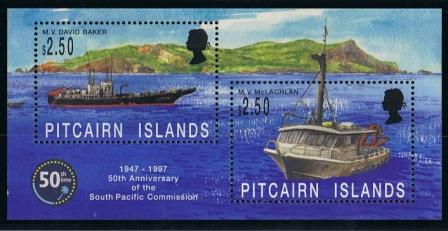 On 26 May 1997 Pitcairn Island issued a MS for the Fiftieth Anniversary of the South Pacific Commission. The region served by the Commission is more than 30 million sq km of which 98 percent is ocean. Only 500 of the 7,500 islands in the region are inhabited with populations ranging from Pitcairn’s 50 people to the 4.2 million in Papua New Guinea.