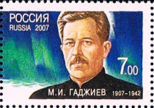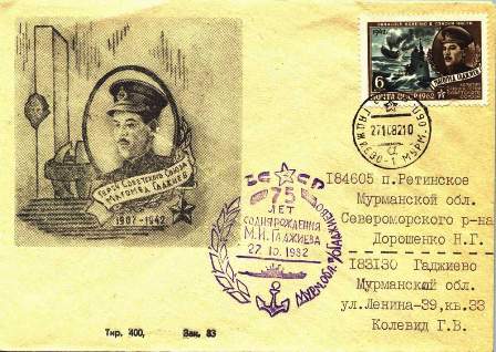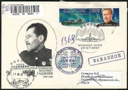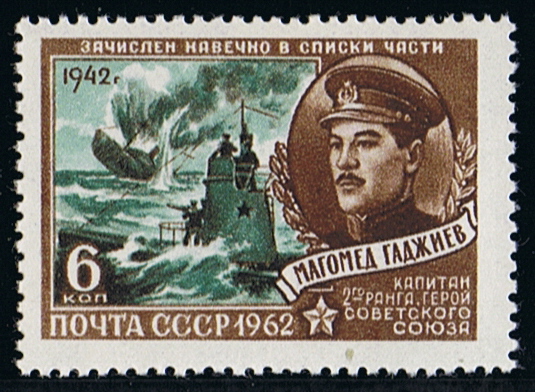 The stamp gives Captain 2nd class Mahomet Gadgiev (also given as Gadschijev or Gadzhiev) a hero of the Soviet Union, with a submarine and a sinking cargo vessel in the background. A Google search did not give much on the Navy Commander that the info below I translated mostly from Enzyklopadia der Maritimen Motive (Navicula)