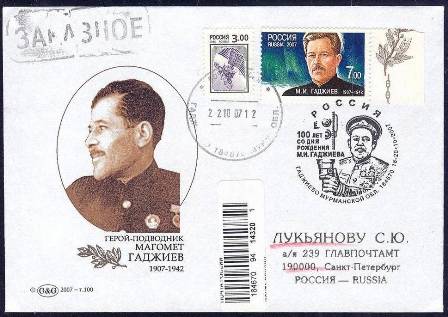 Russia 1962 6k sg2665, scott? 2007 7R sg?, scott? 2007 envelope (most probably the submarine is the K-21 in the margin, see index.)