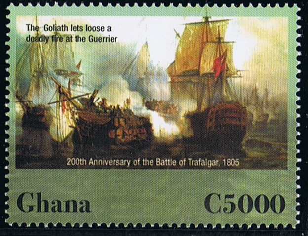Ghana issued a set of 4 stamps for the 200th Anniversary of the Battle of Trafalgar in 2005, of which the C5000 stamp shows a battle scene between the HMS GOLIATH and the French Le GUERRIER, both ships never were used in the Battle of Trafalgar, most probably the stamp is designed after a painting of the Battle of the Nile in 1798.