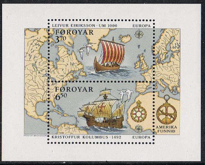 Faroe 1992 3.70 Kr. sg224, scott236, and miniature sheet 3.70 Kr, the other stamp shows us Columbus flagship the SANTA MARIA.