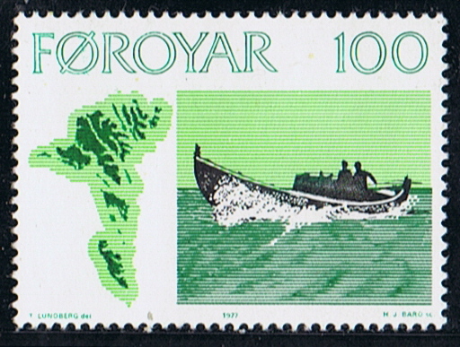 The Faroe boat is the general term for the double-ended pulling boats of the Faroe Islands, it is a distinct boat type, and the stamp shows us one fitted out with a small inboard engine and used for fishing along the coast and the waters between the islands. The boat descends from the Viking ship.
