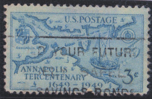 This stamp shows a spritsail vessel, dating from 1649, in Chesapeake Bay but this picture has been copied from a painting of 1642 by a master of the Dutch School, The original is in the Boijman's Museum, Rotterdam while a large sketch of this craft is also reproduced in E. Keble Chatterton's "Fore and Aft Craft and Their Story". The original plate is called "The Arrival at Rotterdam of the Market ‑ Barge between Dordrecht and Rotterdam". Apparently the stamp designer was unable to find a suitable picture of a colonial sailing vessel of the period of the founding of Annapolis in 1649. As a result be may well have decided to "adapt" the only craft available‑a Dutch "market‑barge".