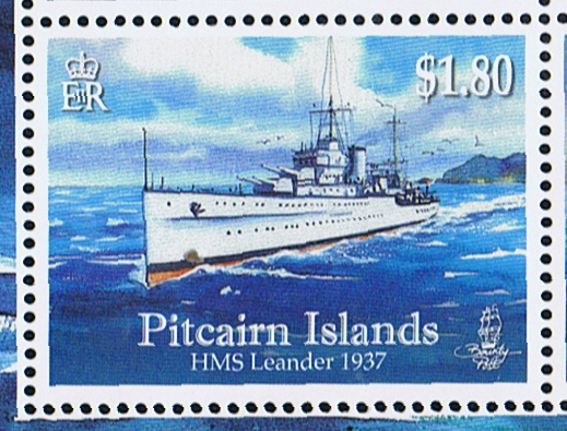 HMS Leander – this light cruiser was launched in 1931 and acquired by New Zealand on loan. En-route to NZ she visited all four islands of the Pitcairn group and her visits were highlighted by the use of her amphibious Walrus aircraft. The plane took aerial photographs to investigate possible flying boat and landplane bases for a projected trans-Pacific extension of Imperial Airways Far East route. The LEANDER landed a shore party on each of the uninhabited islands and mounted a Union Jack and noticeboard proclaiming British sovereignty.