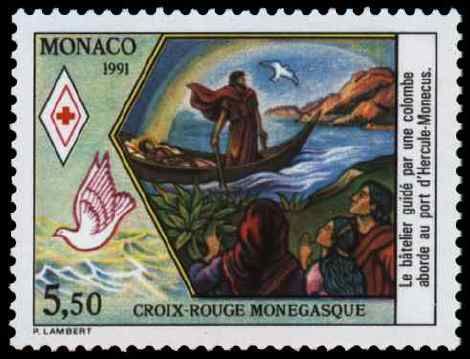 The two stamps for the Red Cross in Monaco issued in 1991 and designed by Lambert depict, a small boat with two people in it, the boatman and most probably his wife, the lower value depict: when they during a terrible storm sighted Hercules Port in Monaco.