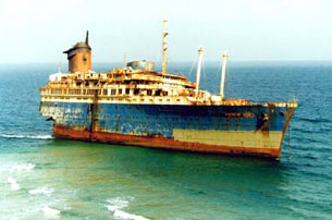 The poor state of the former America as she appears today. Severed in half, she is a sad sight for any ship-buff. (Photo courtesy of Darren Byrne)