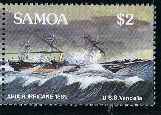 While VANDALIA lay at Mare Island, relations between American and German officials at Apia, Samoa, became increasingly strained. Late in the winter of 1889, at the behest of the American consul in Samoa. VANDALIA, TRENTON, and NIPSIE sailed for Samoa and reached Apia Harbor early in March to balance the presence of the German vessels SMS ADLER, OLGA, and EBER. The British were ably represented by HMS CALLIOPE. On 15 and 16 March 1889, each of these vessels suddenly became trapped in the harbor when violent, hurricane force winds roared out of the northeast, driving mountainous waves before them. ADLER, OLGA, and EBER were all either sunk or hopelessly grounded and torn apart on the sharp reef, and together lost a total of 150 officers and crew killed. The powerful engines of CALLIOPE barely enabled the vessel to get to sea in a dramatic performance that drew cheers from the crews of the American vessels. However, despite heroic efforts by the officers and crews of VANDALIA and TRENTON, the two vessels tore their bottoms out upon the reef on 16 March. VANDALIA struck at about noon and sank until her docks were completely awash, forcing her crew to scramble into the rigging. TRENTON grounded alongside VANDALIA at 2200 that evening, but enough of her main deck remained above water to allow VANDALIA’s crew to climb on board. After the hurricane began, NIPSIC was driven ashore on a sandy beach and was later salvaged.