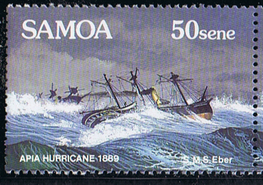Mid March 1889, Samoa was hit by a severe cyclone, while it would have been wiser to send the warships out of Apia harbour to sea, all the ships stayed at anchor in port. Only the HMS CALLIOPE by his more powerful engine escaped to sea.