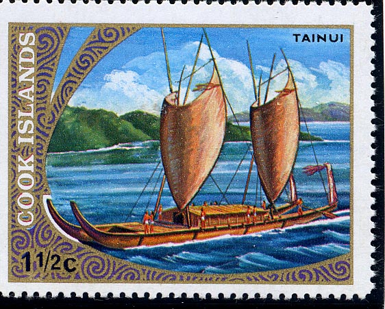 Tainui. An enormous double canoe used on the great trans‑Pacific migrations. New Zealand was settled from Rarotonga in such large canoes, over 70 ft. long, equipped with two claw shaped sails and resembling two canoes joined by massive cross beams, on which was built a large cabin to accommodate the chief and his men while the womenfolk lived in the canoes. Food supplies for the several thousand miles voyage were carried in the deep holds. The tainui had huge blade‑shaped decorations on the stem which were often 20 ft. high and ornamented with the traditional spiral motif of the Maoris.