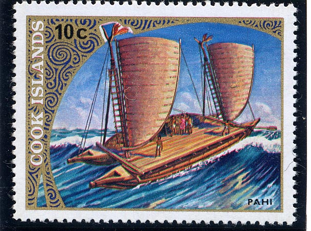 This stamp of French Polynesia depict a “pahi” canoe from the Tuamotu islands, and designed after a painting made by Herb Kane see: