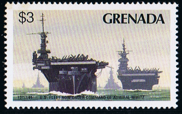 The stamp is designed after a photo showing the Task Group 38.3 entering Ulithi anchorage in column, on 12 December 1944, while returning from strikes on targets in the Philippines.