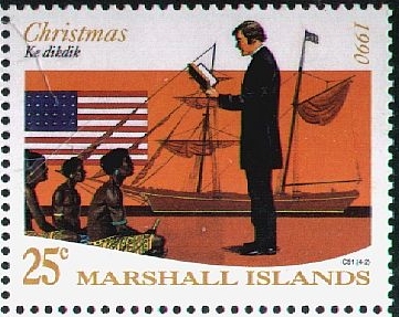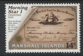 The first Christian service in the Marshall Islands was held on 09 November 1857 at Ebon Atoll. The Chieftain of the atoll, Kaibuke, ordered the natives to pull MORNING STAR through the narrow channel through the reef (as seen on the 44c), and she was the first ship to anchor in Ebon Lagoon, which became her base of operations. She made yearly trips of over 10,000 miles until worn out and sold in Honolulu on 12 December 1865.