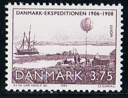 The Danish stamp is designed from a contemporary photograph and shows the DANMARK frozen in the ice at Danmarkshavn.