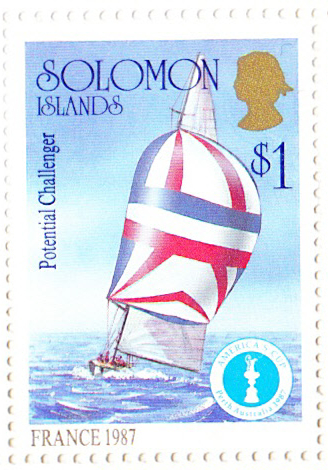 FRANCE. (Solomon Is. 1987 Sheet 9 $1. SG 570a). Appears as a 'potential challenger' on the stamps. The only French challenge came from French Kis in 1987, which appears on another stamp on the sheet. However a syndicate was set up, but ran out of money after it had built the 12 metre yacht Challenge, designed by Daniel Andrieu and skippered by Yves Pajot, so the campaign folded before France was built. It is presumably this yacht which is notionally depicted (a problem with a number of pictures on this sheet).