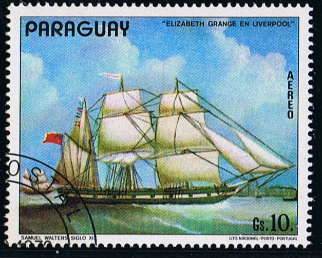 The stamp is designed after a painting made by Samuel Walters (1811-1882) and shows the vessel ELIZABETH GRANGE in the Mersey River at Liverpool.