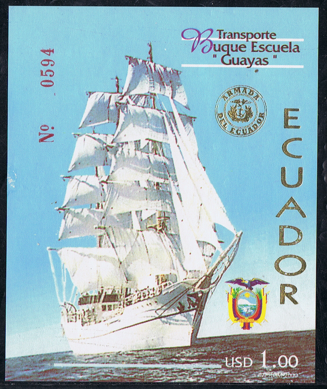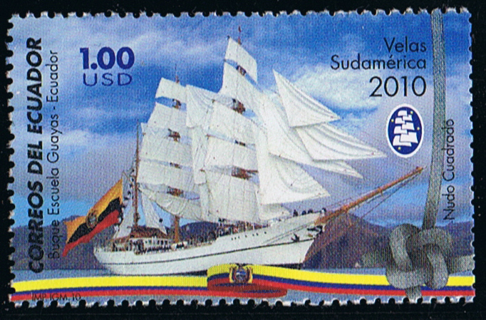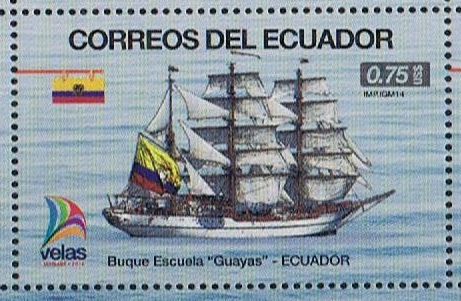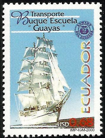 In the year 2000 Ecuador issued a 68c. stamp depicting their sail training vessel, the GUAYAS a steel three masted barque of 934tns. Lengfh 257'5" oa., Hull 219', Breadth 34' 8", Depth 15'4', She was built to a design by Sener Sistemas Marinos.