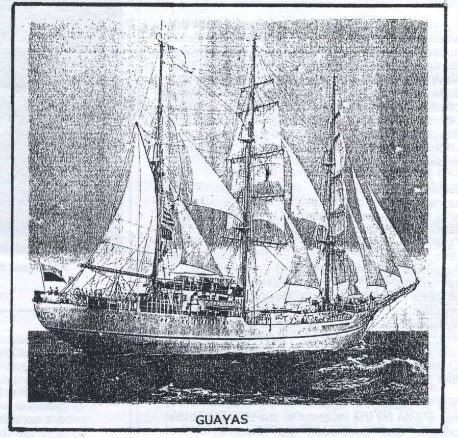She was the second of four sister ships built by ASTACE, the others being GLORIA (Columbia) SIMON BOLIVAR (Venezuala) and CUAHTEMOC (Mexico) GUAYAS was named after Ecuador's main river and is run by the Naval Superior School in Guayanuil. She is fitted with a 700 h.p. Auxiliary diesel motor. She has a permanent crew of 87 plus 63 cadets. Her figurehead is of an Andea Condor.