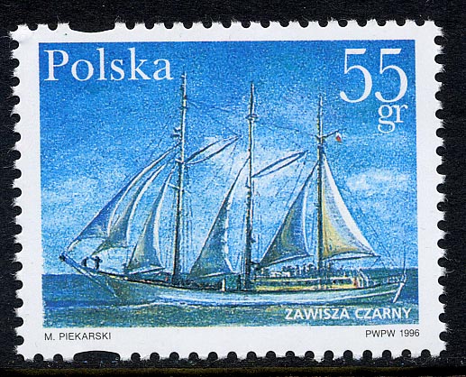 "Zawisza Czarny" is the second training vessel of that name; the first was a wooden schooner built in 1902. This is a steel 3-masted schooner built in Gdansk in 1952. The double mainsail booms, one on either side of the sail, give rise to the name 'wishbone schooner'.