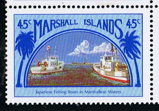 The fishing boats depict on this stamp are Japanese and follows the huge schools of tuna and other fish into Marshall waters. Catchers boats often with mixed Marshallese and Japanese crews, work in teams spreading their nets over a wide area, then converging to gather their catch. The catch is then taken to the mother ship, which often serves as a floating cannery. On such ships, the tuna is cleaned, processed, canned, labelled and boxed.