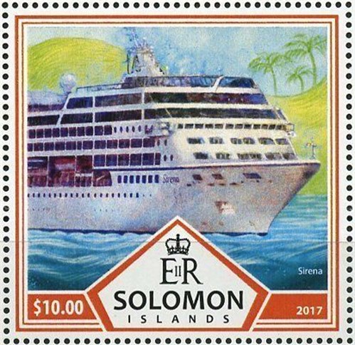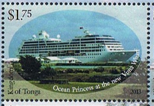 The stamp shows around 15 vessels, with in the foreground 4 cruise vessels, which haven been identified from left to the right AMADEA, TAHITIAN PRINCESS, ALBATROS and MAXIM GORKIY, only the TAHITIAN PRINCESS has not appeared on a stamp before. Her details and history are given below.