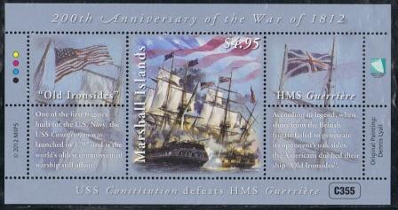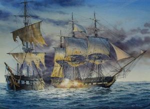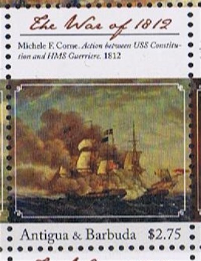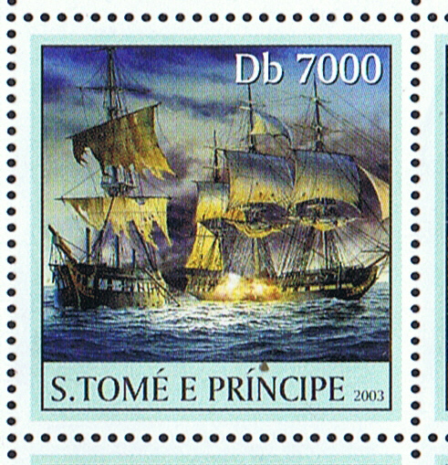 The stamp of St Tomas et Prince 2003 7000Db the design is taken from a painting made by Richard C. Moore which shows us the battle between the USS CONSTITUTION and HMS GUERRIERE in 1812. http://shipmodeling.info/photo/displayi ... riere.html