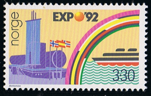 Norway issued in 1992 two stamps to commemorate EXPO 1992 in Seville, Spain both stamps shows a ship the 3.30 Kr has a stylized passenger ship with two funnels, while the other stamp of 5.20 Kr which has been identified by Mr. Morten Sæbø as the PETROJARL I via a maxi-card. The rainbow connects seen on the stamp connects Spain with Norway.